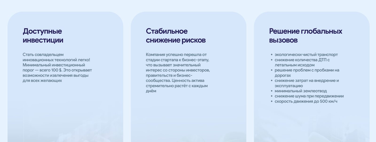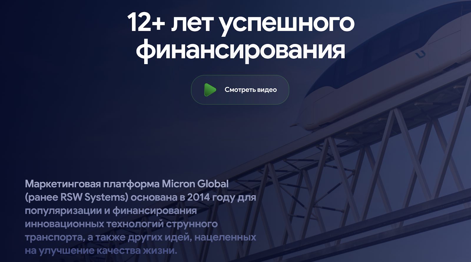 «Микрон Глобал» подает себя как международную маркетинговую платформу, которая помогает собирать деньги на перспективные разработки. Главный акцент — на струнном транспорте: скоростные подвесные дороги, экологично, без пробок, до пятисот километров в час.
