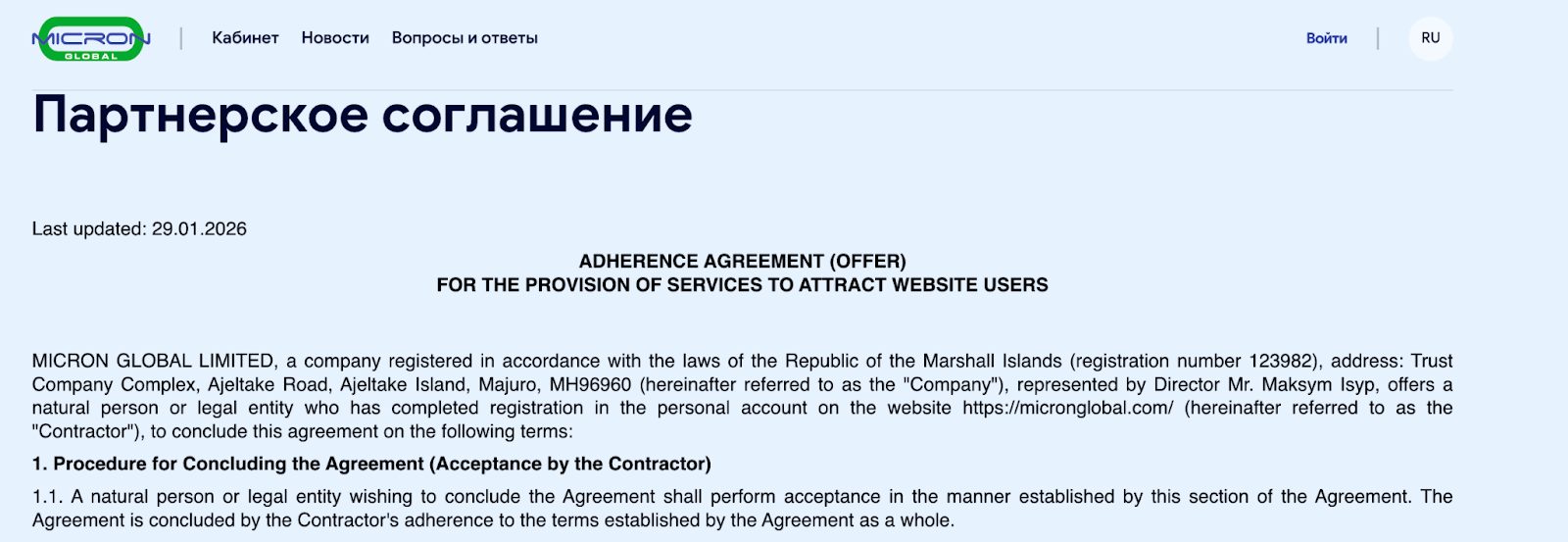 Компания зарегистрирована как юридическое лицо и в открытых источниках фигурирует как Micron Global Limited. География регистрации данной платформы — хорошо знакомые нам Маршалловы острова. В статусе директора компании указан некий как Mr. Maksym Isyp. Адрес типично «офшорный»: Trust Company Complex в Маджуро.