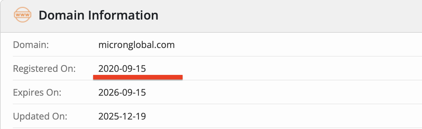 Первая и самая заметная несостыковка касается предполагаемого возраста компании. По словам создателей, она якобы присутствует на рынке с 2014 года, однако домен micronglobal com появился только в сентябре 2020-го. Более того, фактически сайт начал использоваться в конце 2025 года.