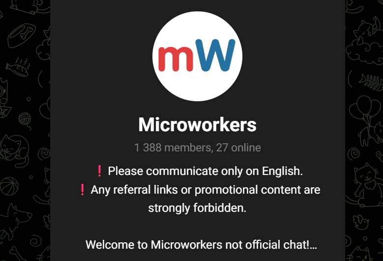 В Телеграме есть Microworkerschat он является исключительно англоязычным. Там есть свои правила публикации, запрещающие ссылки, рекламу и прочее. Следует отметить низкую активность, как по сообщениям, так и по участникам. Всего тут насчитывается более 1,2 тысяч участников, но онлайн составляет всего несколько десятков.