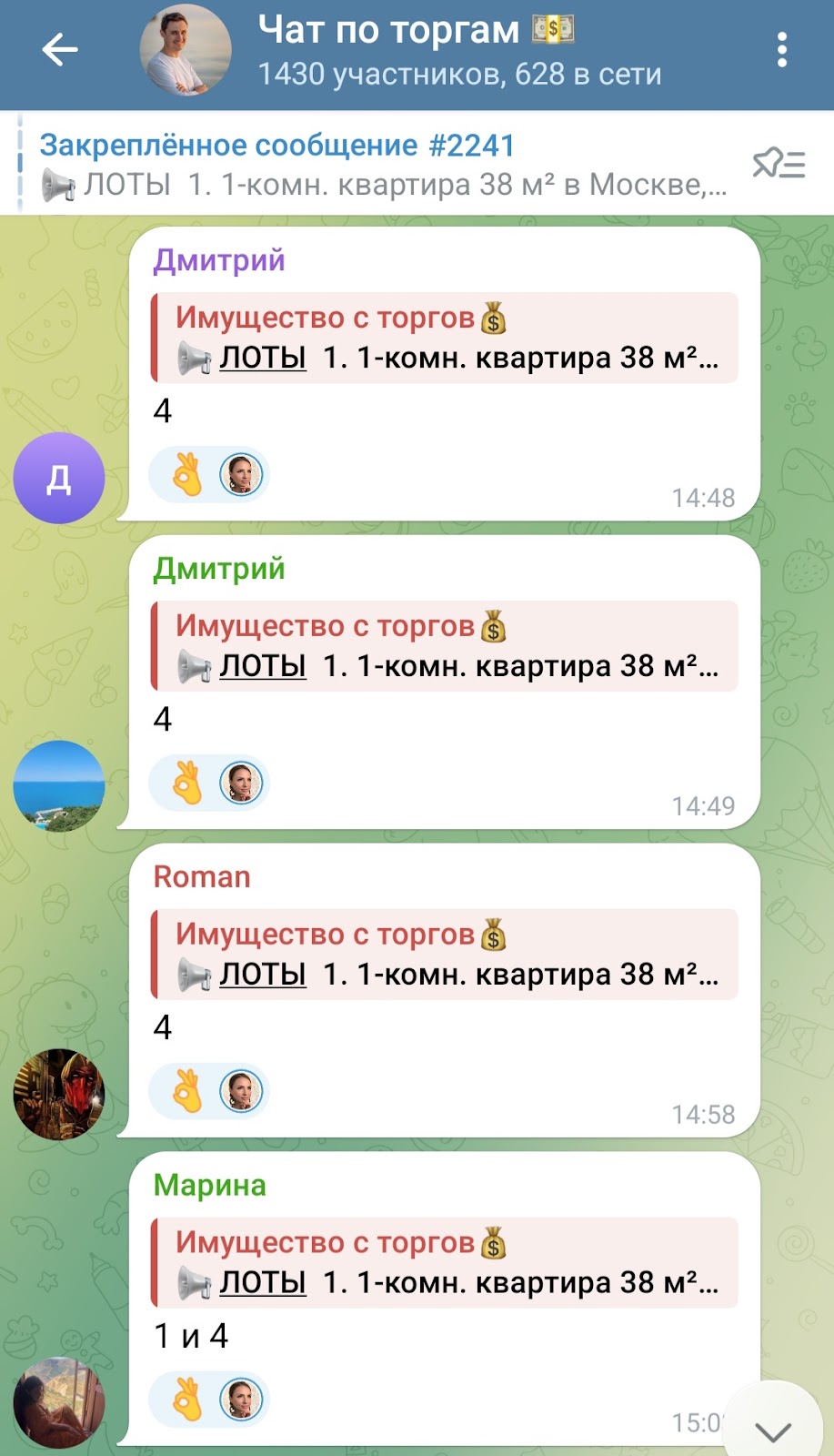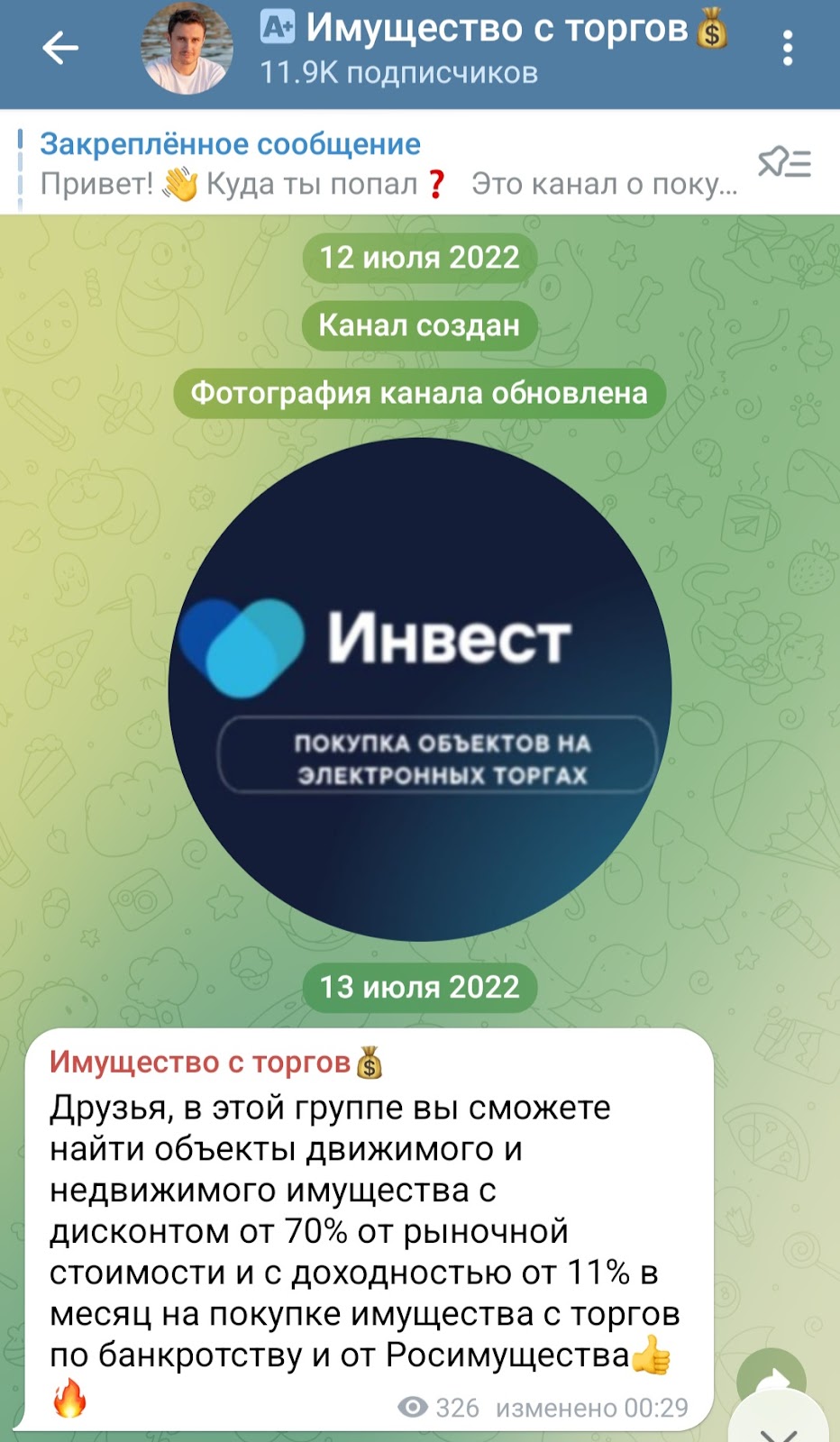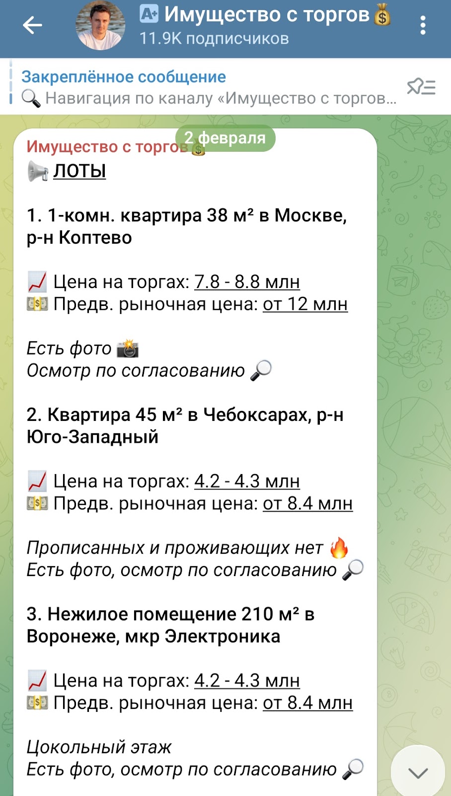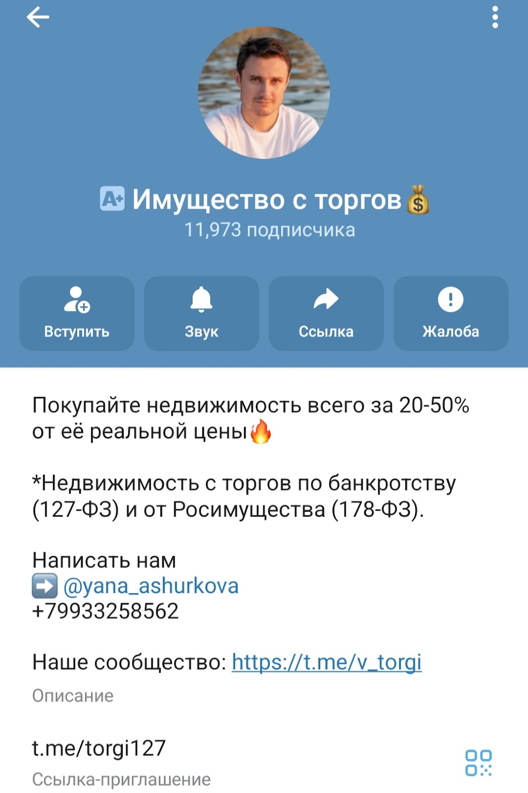 Группа зарегистрирована в мессенджере под юзернеймом torgi127. В ней обещают публиковать объекты движимого и недвижимого имущества, которые выставлены на аукцион и продаются по цене ниже среднерыночной. Но информация по предполагаемой экономии противоречивая. Например, в описании канала заявлено, что стоимость объектов составляет 20-50% рыночной, а в первом посте речь идет о скидке не менее 70%.