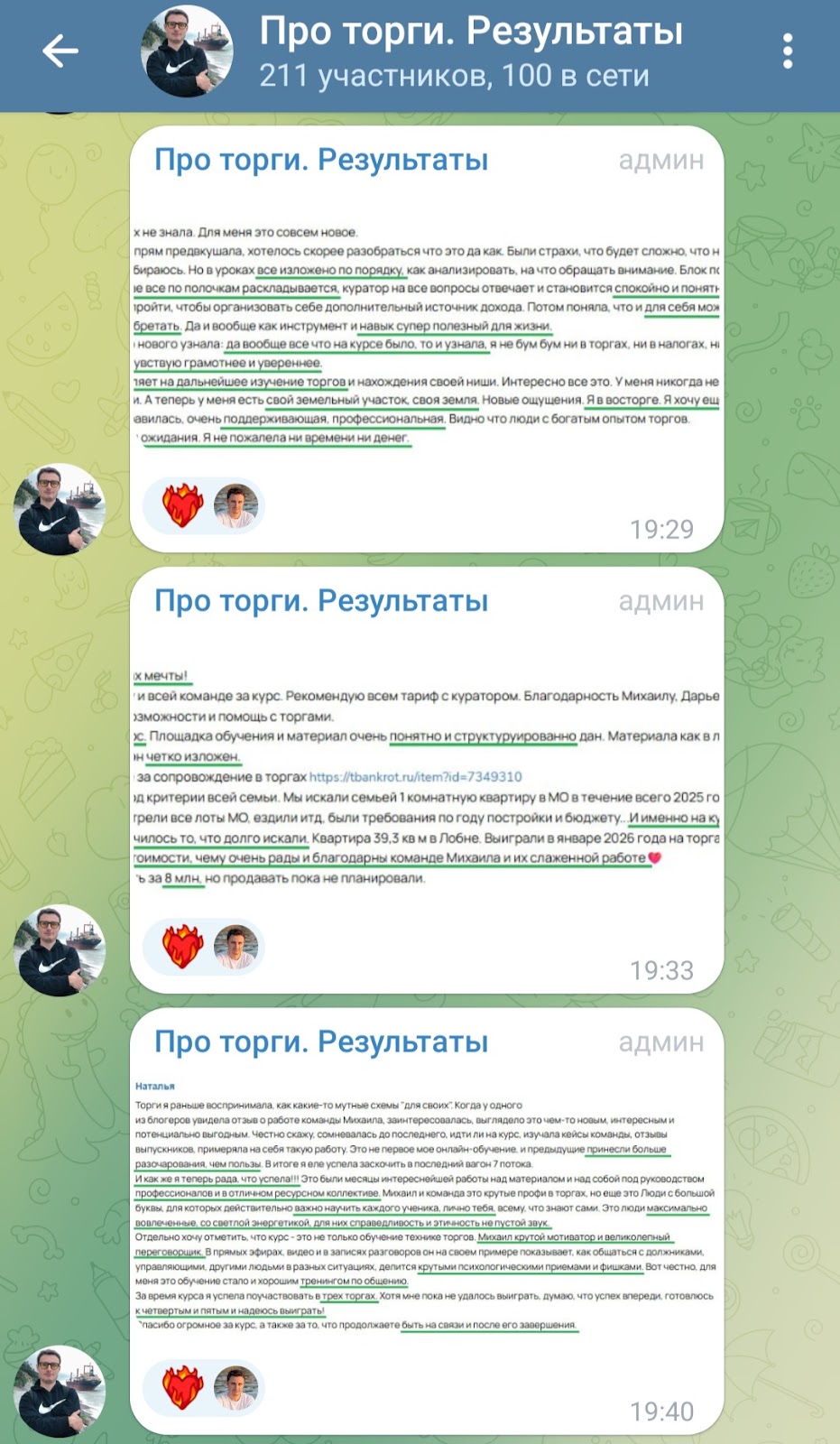 У Михаила есть еще один канал в ТГ — “Про торги Результаты”. В нем администратор публикует отзывы клиентов. Подписчики при этом оставлять сообщения не имеют права. Судя по выложенным постам, все довольны сотрудничеством с Уколовым.