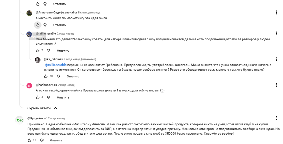 Зрители оставляют под видео разные комментарии. Большинство благодарит за полезные советы и идеи, но есть и те, кто заявляет, что Михаил Гребенюк — аферист, чья деятельность заточена исключительно на продажу собственных инфопродуктов сомнительного качества.