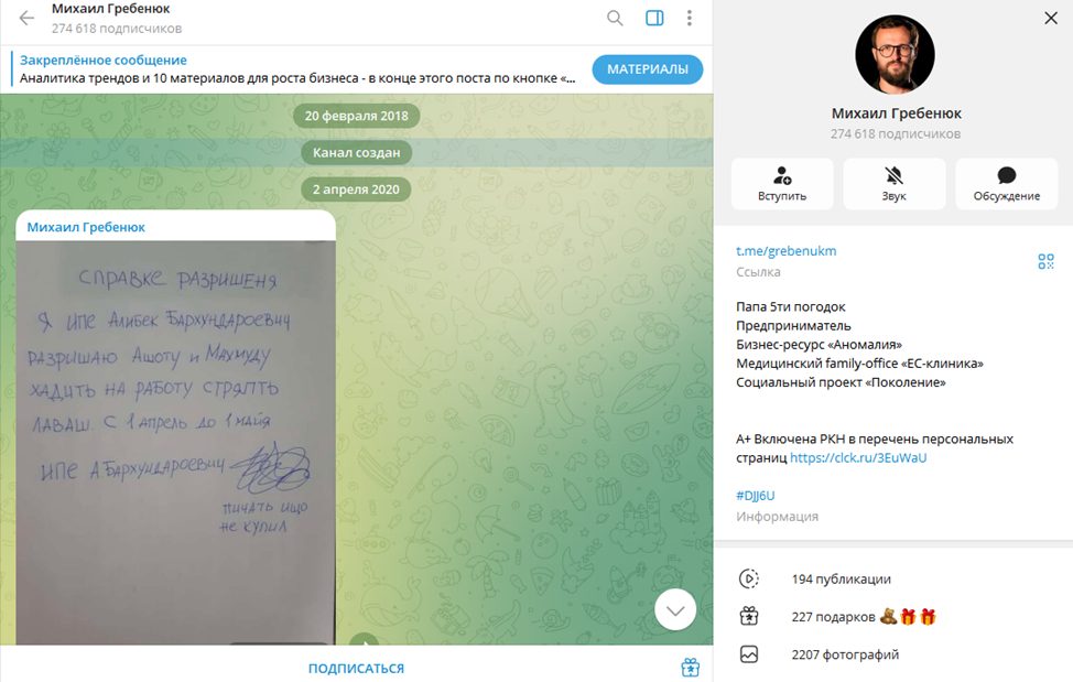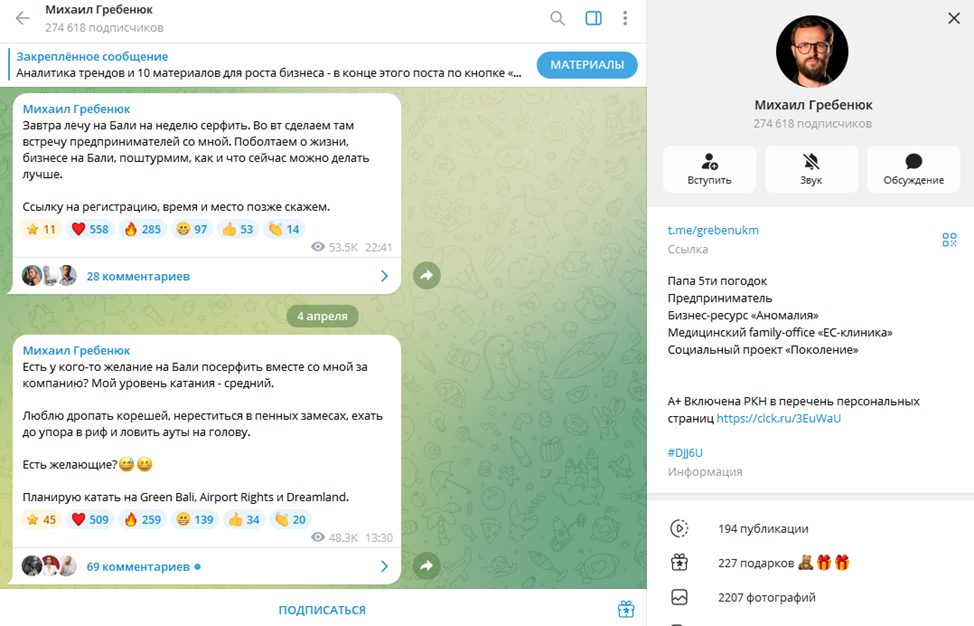 Для поддержки личного бренда Михаил нанял профессиональную команду, создающую контент для нескольких аккаунтов в социальных сетях. Все профили зарегистрированы в РКН в соответствии с российским законодательством. Тг-канал @ GrebenukM создан 20 февраля 2018 года, но все посты за первые 2 года работы удалены.