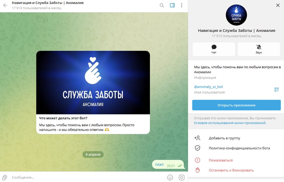 Служба поддержки экосистемы «Аномалия» доступна в тг-боте @ Anomaly Sz Bot.