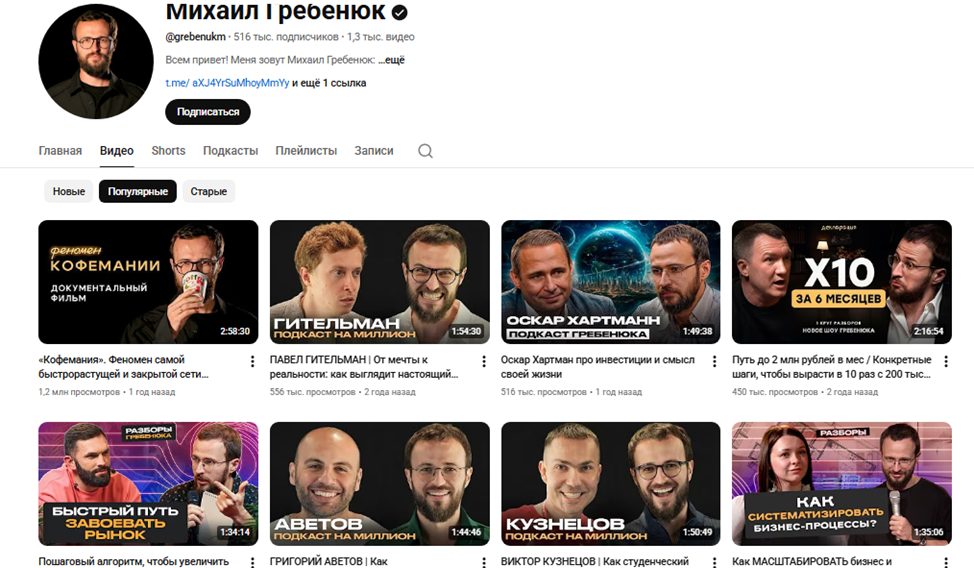 Ютуб-канал @ Grebenukm имеет аудиторию в 500+ тыс. человек и демонстрирует хорошую статистику. Зрителям предлагают интервью с инфлюенсерами, а также разборы реальных кейсов по масштабированию бизнеса.