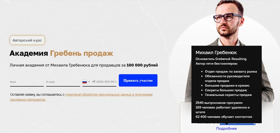 «Курс гребень продаж» от Михаила Гребенюка — флагманский онлайн-курс для менеджеров по продажам. Программа состоит из 97 уроков и содержит более 40 часов уникального видеоконтента.