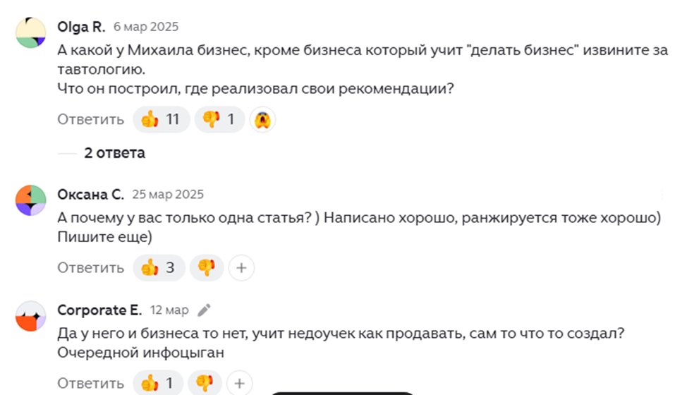 Своими лонгридами Михаил Гребенюк собрал разные отзывы — от благодарностей за ценную информацию и лайфхаки до жалоб на уровень и качество подачи материалов. Одна из читательниц недовольна тем, что автор призывает нарушать российское законодательство, а также пренебрежительно относиться к сотрудникам, экономя на премиях и заработной плате.