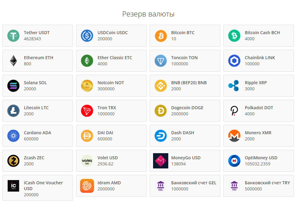 На сайте Майн Чейндж указано, что сервис обрабатывает более 5000 заявок ежедневно и активно используется на рынке СНГ. Также заявлены резервы по различным валютам, включая USDT, BTC, ETH и фиатные направления.