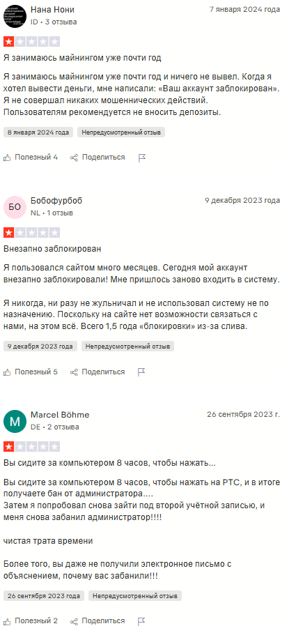 Еще один отзыв описывает все подобные облачные майнинговые платформы как схемы для кражи денег без выплат. Автор инвестировал $5000 и ничего не получил. Он выразил сожаление о выборе этого проекта. Следующий участник рассказал, что занимался майнингом почти год без единого вывода. При попытке вывести средства аккаунт был заблокирован без объяснений.