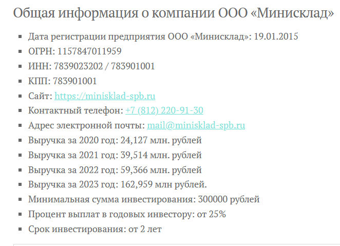 Минисклад СПБ – это компания из Санкт-Петербурга, которая оказывает услуги ответственного хранения вещей и мебели, а параллельно привлекает средства частных инвесторов под фиксированный процент. Формально речь идет о складском бизнесе с сетью точек, но условия «заработка» выглядят как долговое финансирование с высокой ставкой и риском просрочек.