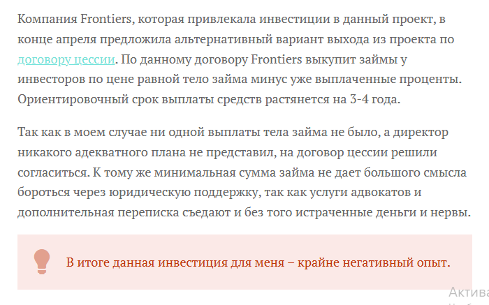При возникновении проблем с выплатами для инвестора возможен сценарий реструктуризации, когда вместо обычного возврата предлагаются альтернативные схемы выхода. В открытых описаниях фигурирует вариант, при котором права требования по займу выкупаются по условиям «тело займа минус выплаченные проценты».