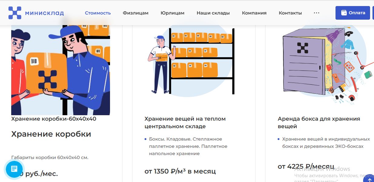 - хранение коробки 60×40×40 см за 350 рублей в месяц;