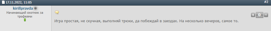 На начало 2026 года в Интернете удалось найти единственный положительный отклик геймера под никнеймом Kirillpravda. На одном из форумов он написал, что игра простая и для фарма достаточно побеждать в заездах.
