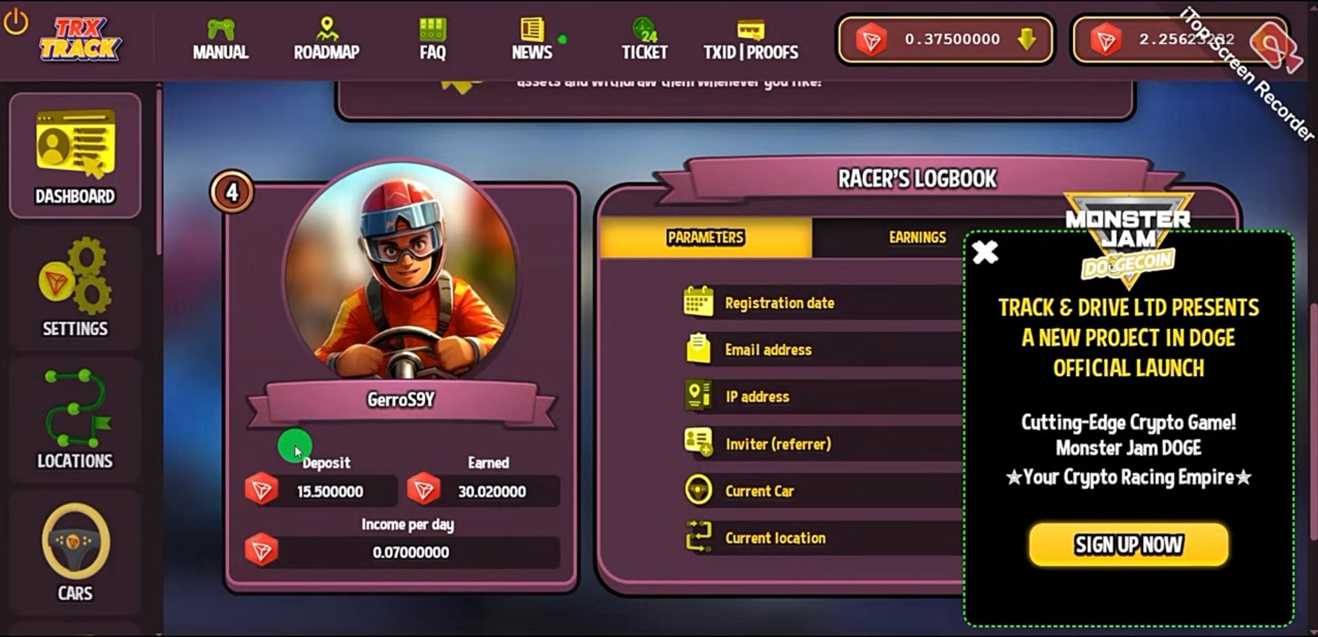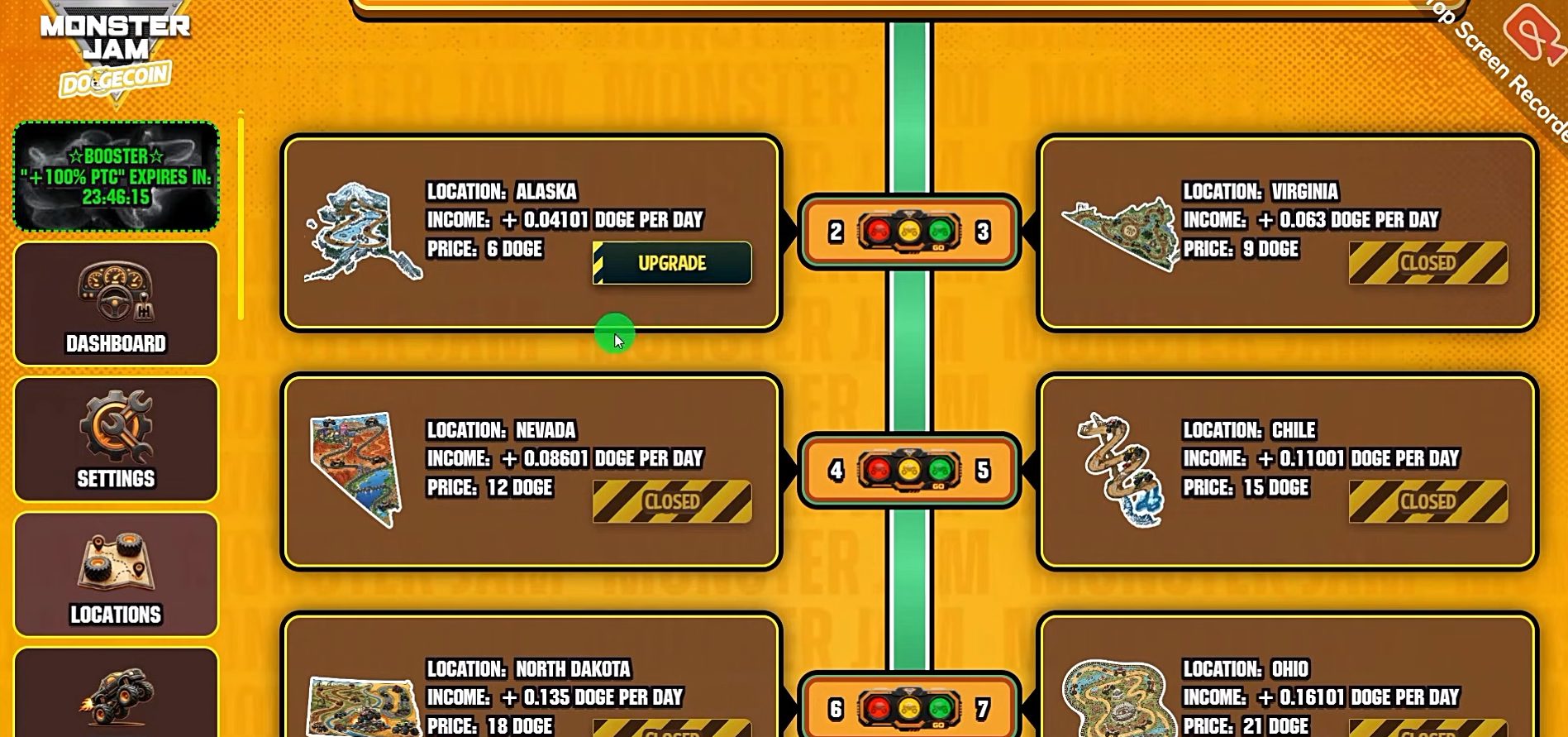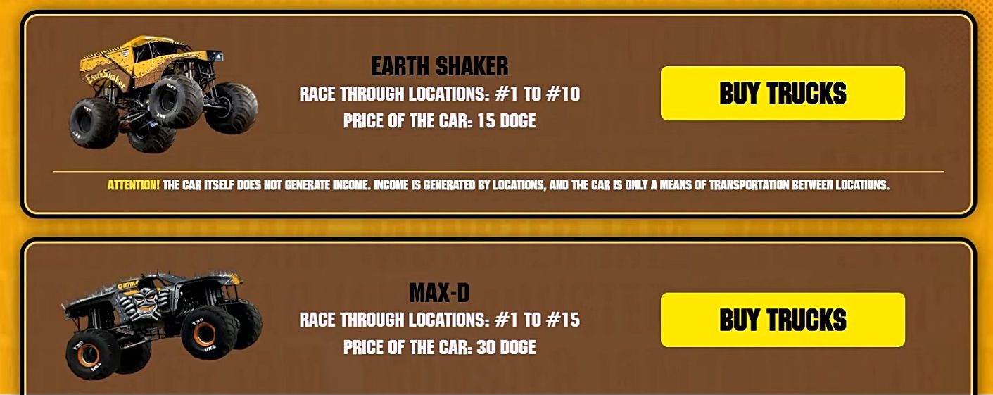 Для начала игры пользователю нужно создать аккаунт, система не потребует верификации и подтверждения электронной почты. Новым геймерам автоматически выдают стартовую трассу и автомобиль для фарма монет. В отдельном разделе Monster Jam Doge есть список доступных заездов, которые можно покупать по мере добычи токенов. Помимо простой покупки, трассы можно улучшать для повышения доходности, а их стоимость стартует с 6 DOGE.