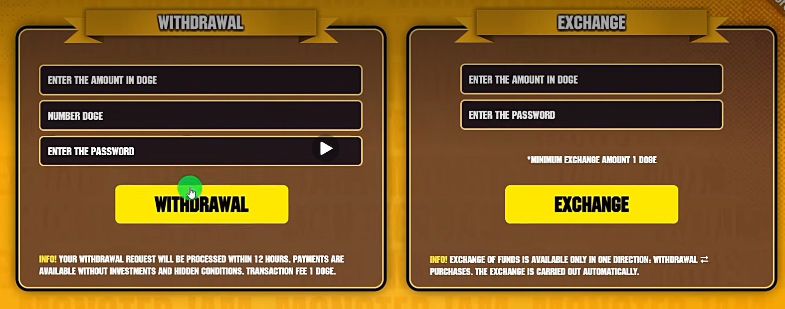 Для вывода клиентам предлагали только DOGE. Минимальная сумма для оформления заявки – 10 токенов с комиссией в 10%.