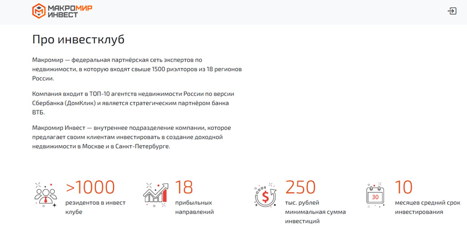 В описании компании сказано, что она входит в ТОП-10 агентств по версии «Дом Клик» и является официальным партнером ВТБ. В клубе проекта находится более 1000 членов, для которых предусмотрено свыше 18 прибыльных направлений для вложения средств.