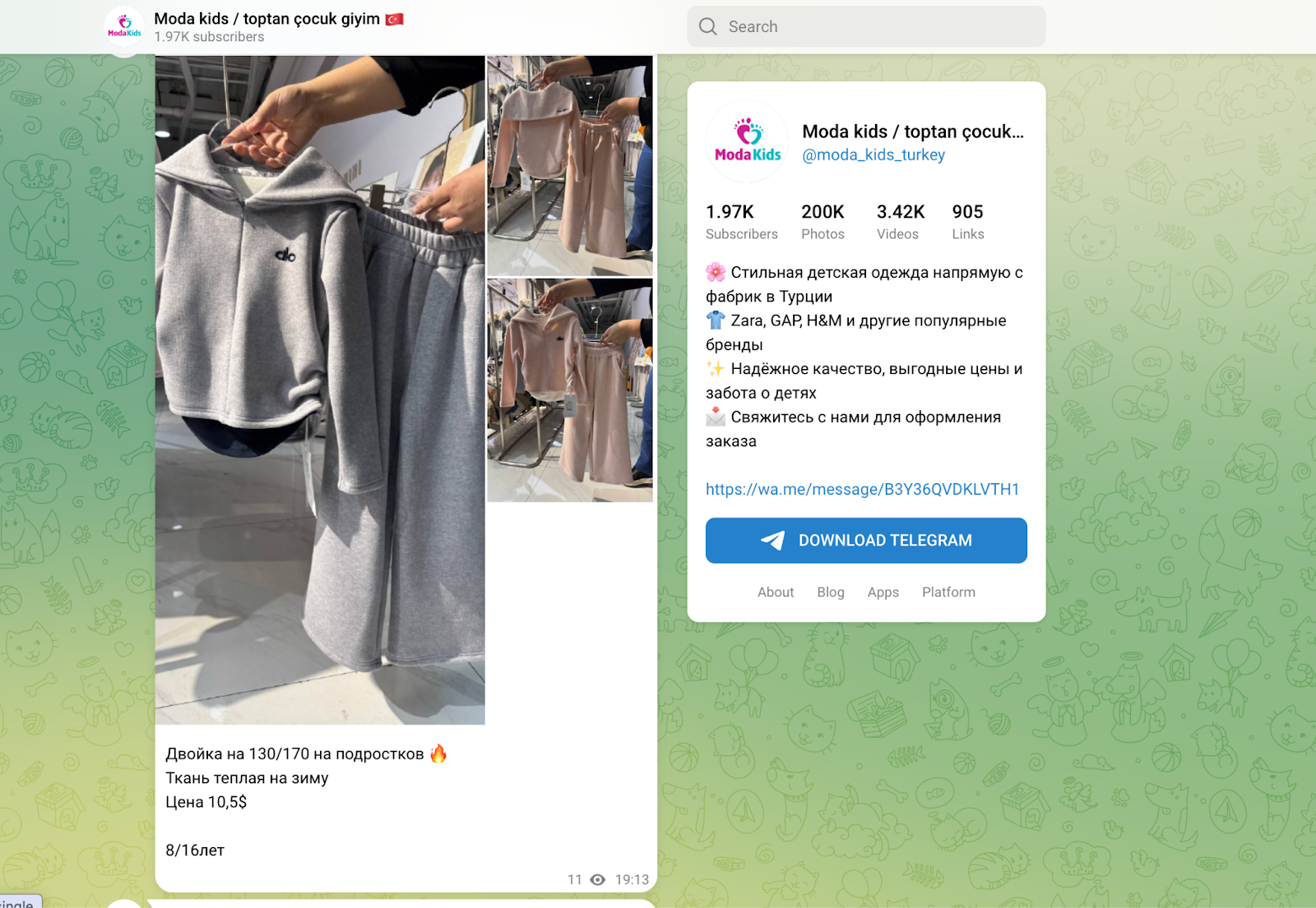 Moda Kids Turkey — телеграмм магазин оптовой детской одежды из Турции, позиционирующий себя как поставщик недорогих партий прямо с фабрик. Проект работает в формате витрины, где выкладываются партии товара, а заказы оформляются через WhatsApp. Далее разберем работу магазина, что говорят пользователи в сети и честный ли это проект.