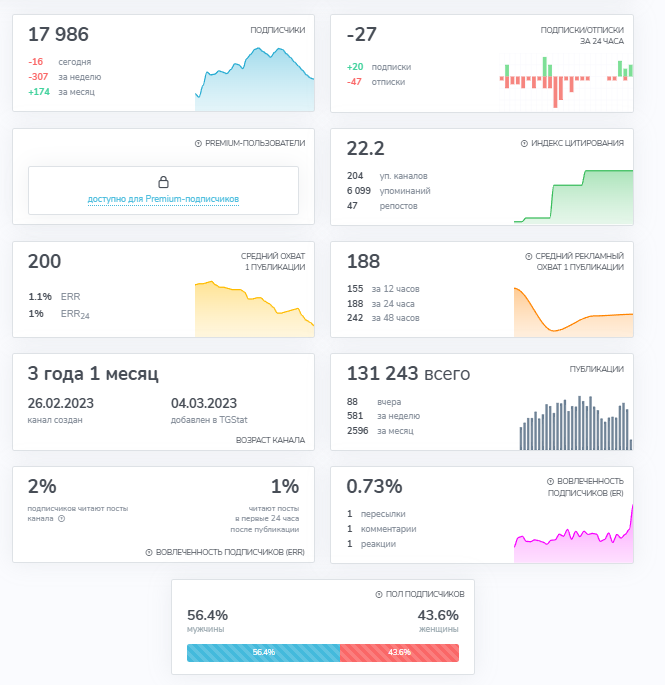 Канал в Телеграм запущен в 2023 году, на него подписалось почти 18 000 пользователей, но по статистике с TgStat сложно сказать о накрутке, ведь каждый день выходят десятки постов.