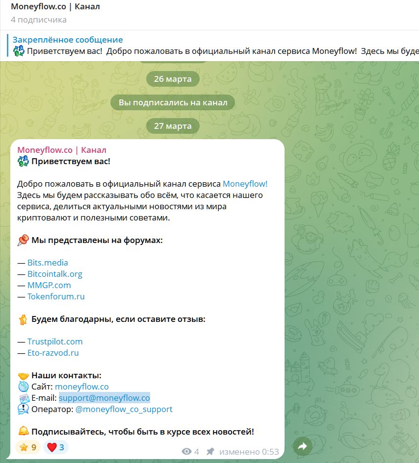 - В ТГ канале сервиса MoneyFlow регулярно обновляется только анонс работы обменника. Нет отзывово о работе портала, комюнити пользователей.
