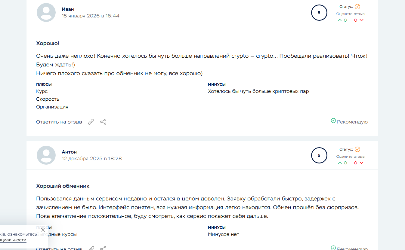 Найдено всего пять явно заказных отзывов про успешный обмен на этом сайте. Комментаторы могли выгодно обменять крипту на неработающем портале в январе 2026 года.