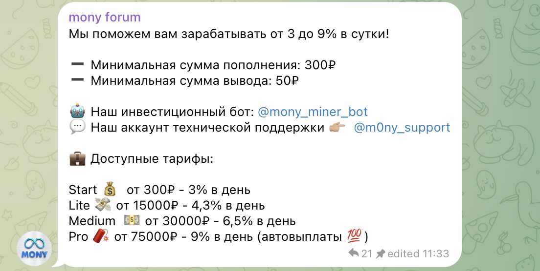 Помимо самого бота, проект обычно сопровождается телеграм-каналом или новостным чатом. Там публикуются обновления платформы, отчеты о росте проекта и скриншоты якобы успешных пользователей. Такие публикации создают ощущение активности и постоянного развития проекта. В ленте также можно встретить несколько типов постов: информационные публикации, мотивационные посты и спецпредложения.