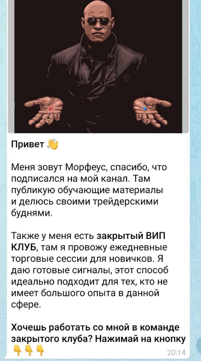 Работает бот, с кодовым названием “синяя таблетка”, который предлагает вступить в VIP клуб. Чтобы туда попасть, необходимо зарегистрироваться у спонсора, отправить ID трейдеру — Morpheus Elixir, – и внести минимальный депозит от 10 долларов.