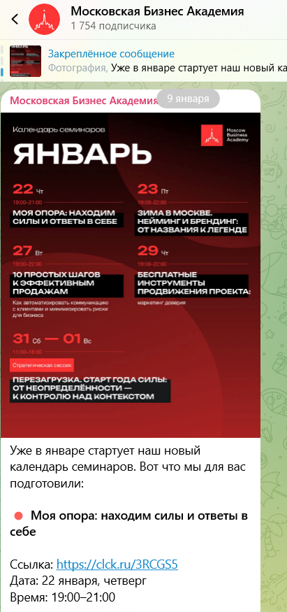 На телеграмм-канал с ником MBAMoscow подписано более 1 700 человек. На нем публикуются анонсы семинаров и других событий, новости о скидках на обучение и различные полезные статьи для бизнесов.