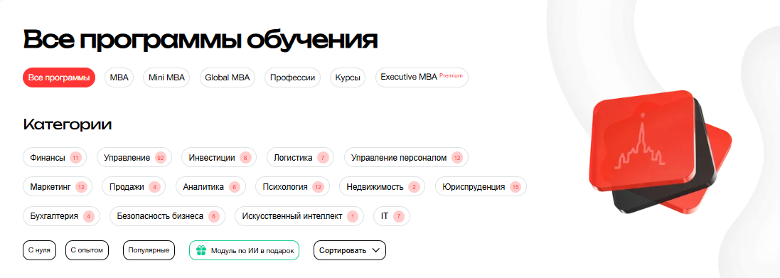 Образовательный проект MoscowMBA предлагает студентам большой выбор программ для обучения по разным категориям: