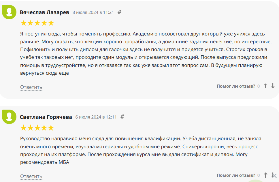На сторонних сайтах в Интернете о Moscow Business Academy большинство отзывов положительного характера, в которых благодарят за хорошие материалы для изучения, удобный формат прохождения уроков, а также выдачу сертификатов и дипломов.