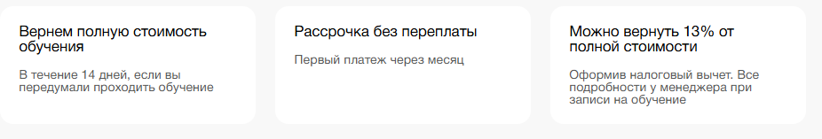 Приобрести обучающую программу можно в рассрочку, а также менеджеры расскажут как оформить налоговой вычет за оплату учебы. Вместе с тем на сайте обещают, что вернут полную стоимость обучения в течение 2 недель, если студент передумает.