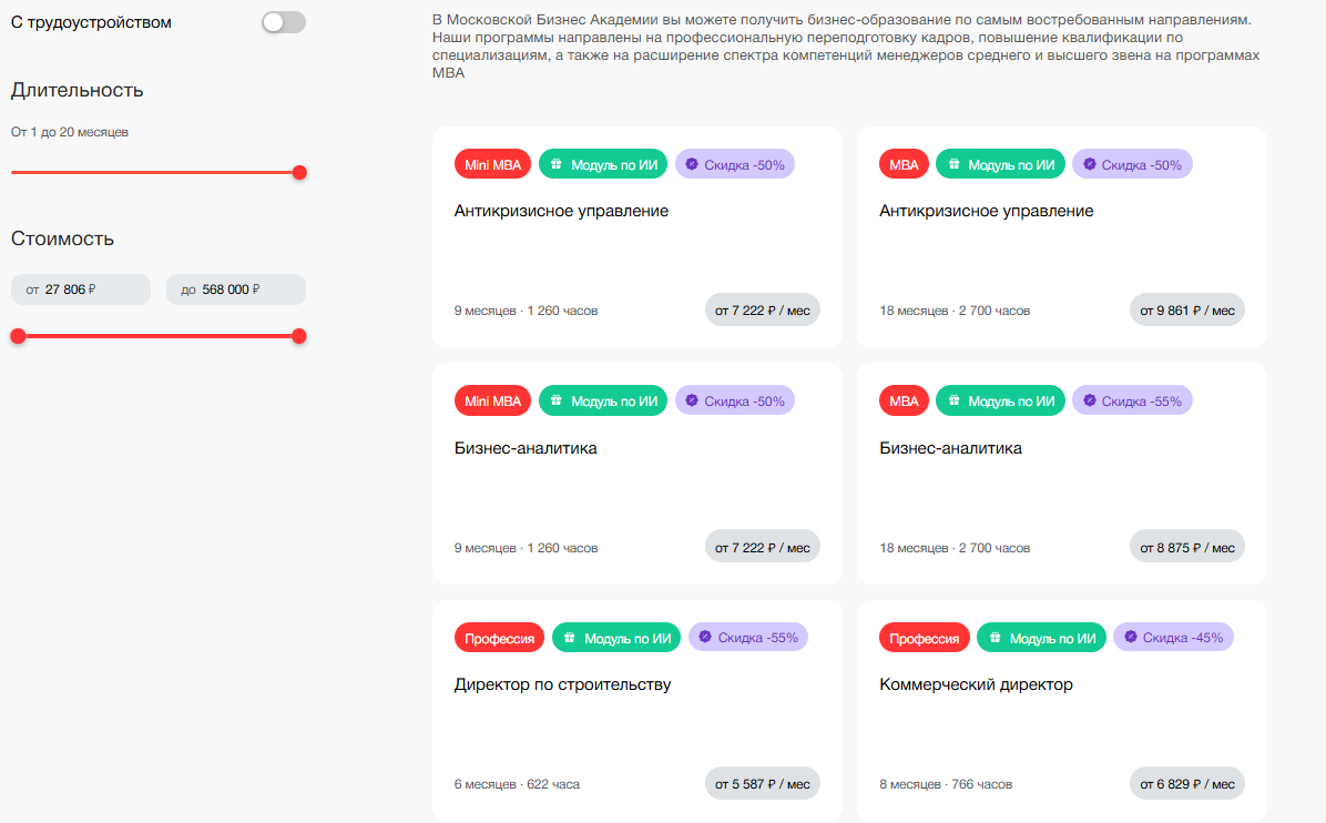 Длительность обучений варьируется от 1 до 20 месяцев, а самая высокая стоимость обучающего курса составляет ₽568,000. На январь 2026 года на все программы установлены скидки до 70%.