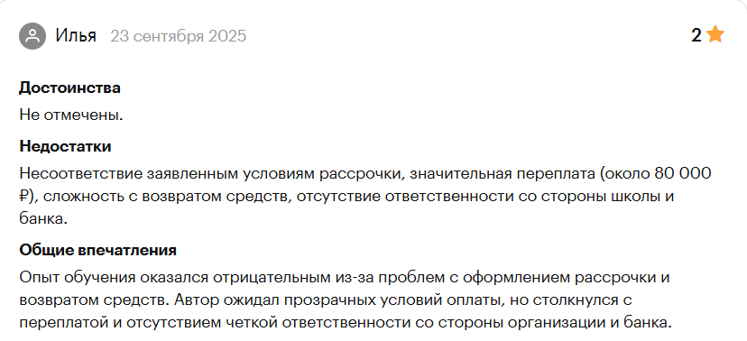 На сервисе Rbc ru курсы онлайн-школы имеют оценку 8,7, а в единственном отрицательном отзыве студент описал проблему с получением рассрочки.