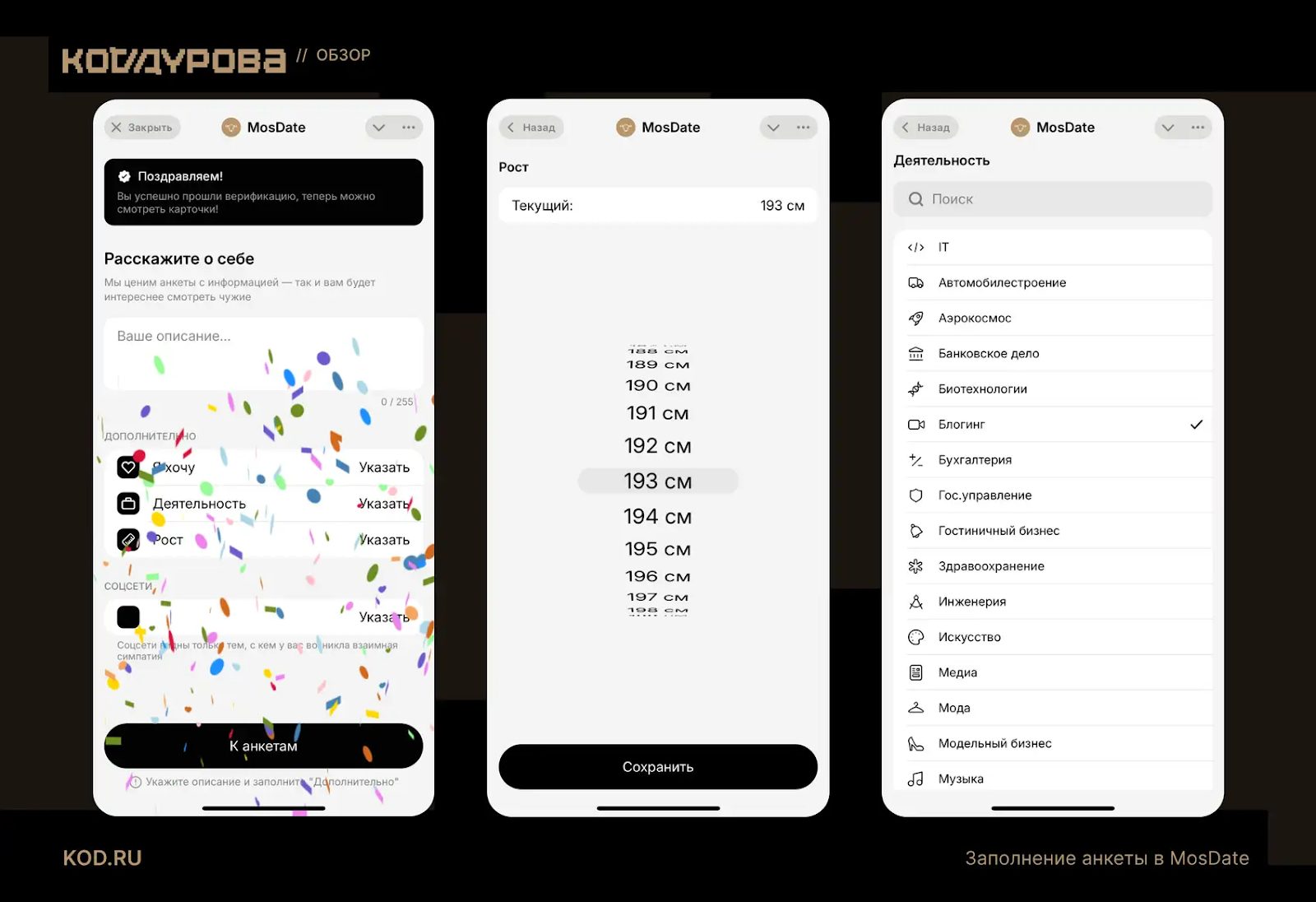 Модерация анкет идет вручную и стоит отметить, что около 70% пользователей на платформу не попадают. Жесткая фильтрация необходима, чтобы отсеять нежелательные кадры и создать имиджевость приложения MosDate. Общая концепция сохранилась — свайп влево-вправо. Есть еще кнопки с аналогичной функцией — можно использовать кому как удобно.