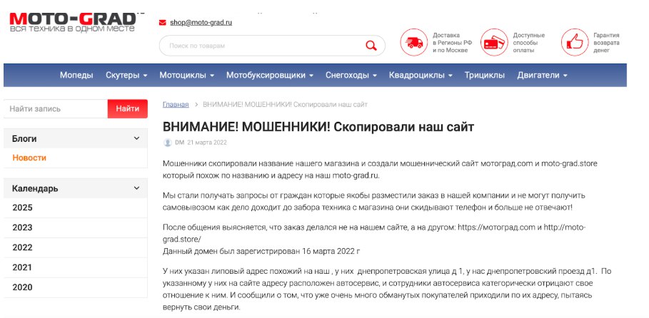 Также компания Motograd имела фейковый домен, сами владельцы объявляли об этом на своем сайте. Была создана похожая страница под названием «Мотоград.com» и motograd-store. Оригинальный домен был назван следующим образом — moto-grad.ru.