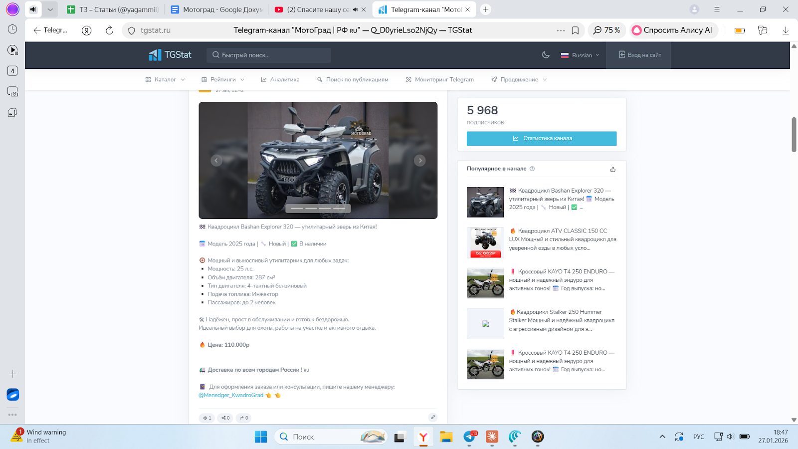 На момент января 2026 года сервис недоступен. Ссылка на телеграм недействительна. Однако, информация о канале доступна на сайте TGStart.ru. Владельцы доставляли технику по всей России. Аудитория насчитывала 5.9 тысяч человек. Основная масса постов — объявления о продаже. К примеру, клиентам предлагали покупать модели квадроциклов 2025 года. Цены стартовали от 100 тысяч рублей.