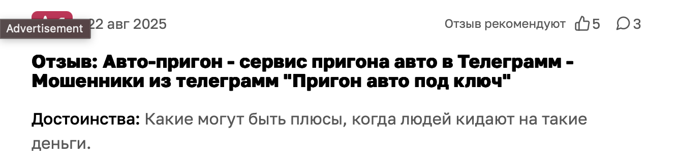 Независимые мониторинги и форумы кишат дисклеймерами о похожих схемах. В них все повторяется из раза в раз: обещания «доставки авто из Европы под ключ», «цены ниже рынка» и предоплата на карту.