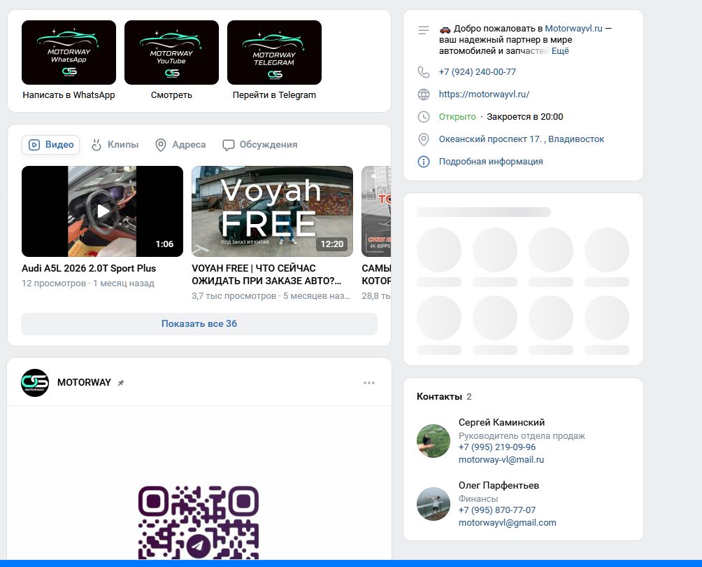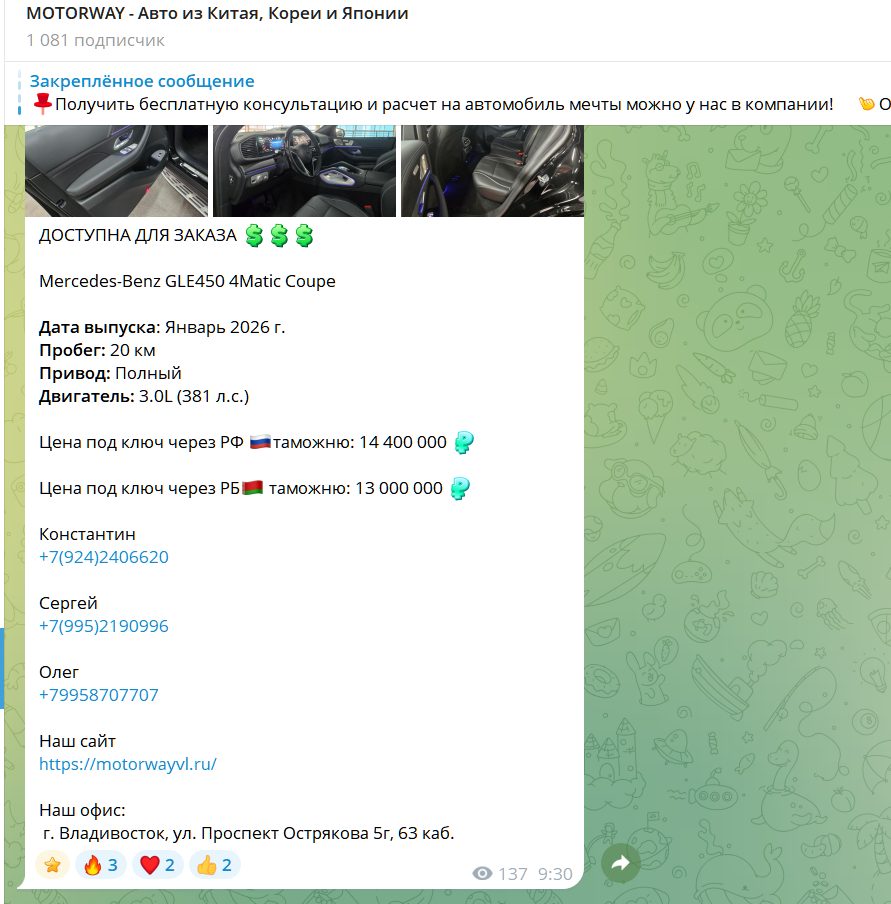 Для обратной связи есть канал Motorway Телеграм, телефоны посредников и адрес офиса фирмы во Владивостоке.