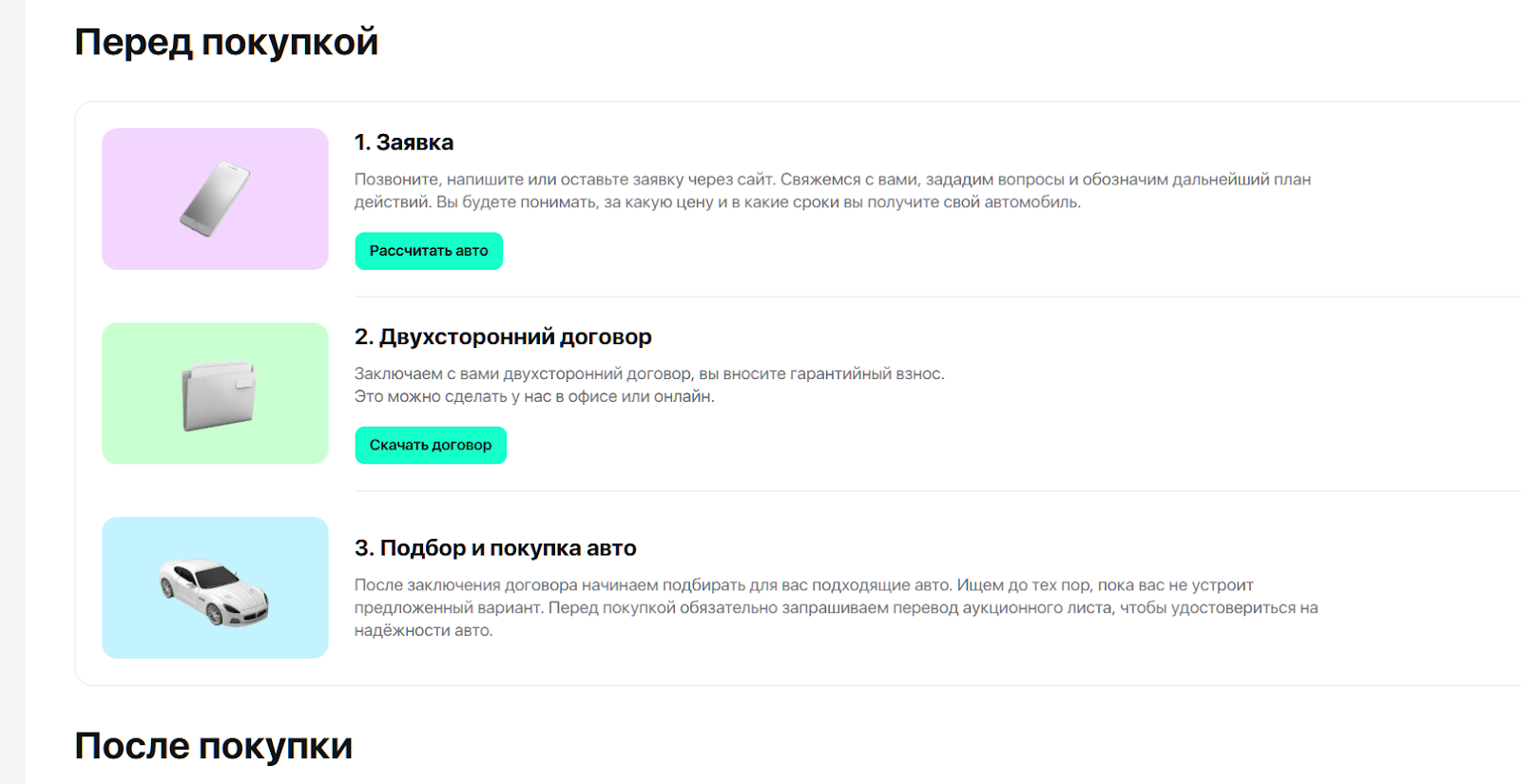 2. Посредник подбирает вариант авто на аукционах до тех пор, пока клиент не остановится на конкретной машине.