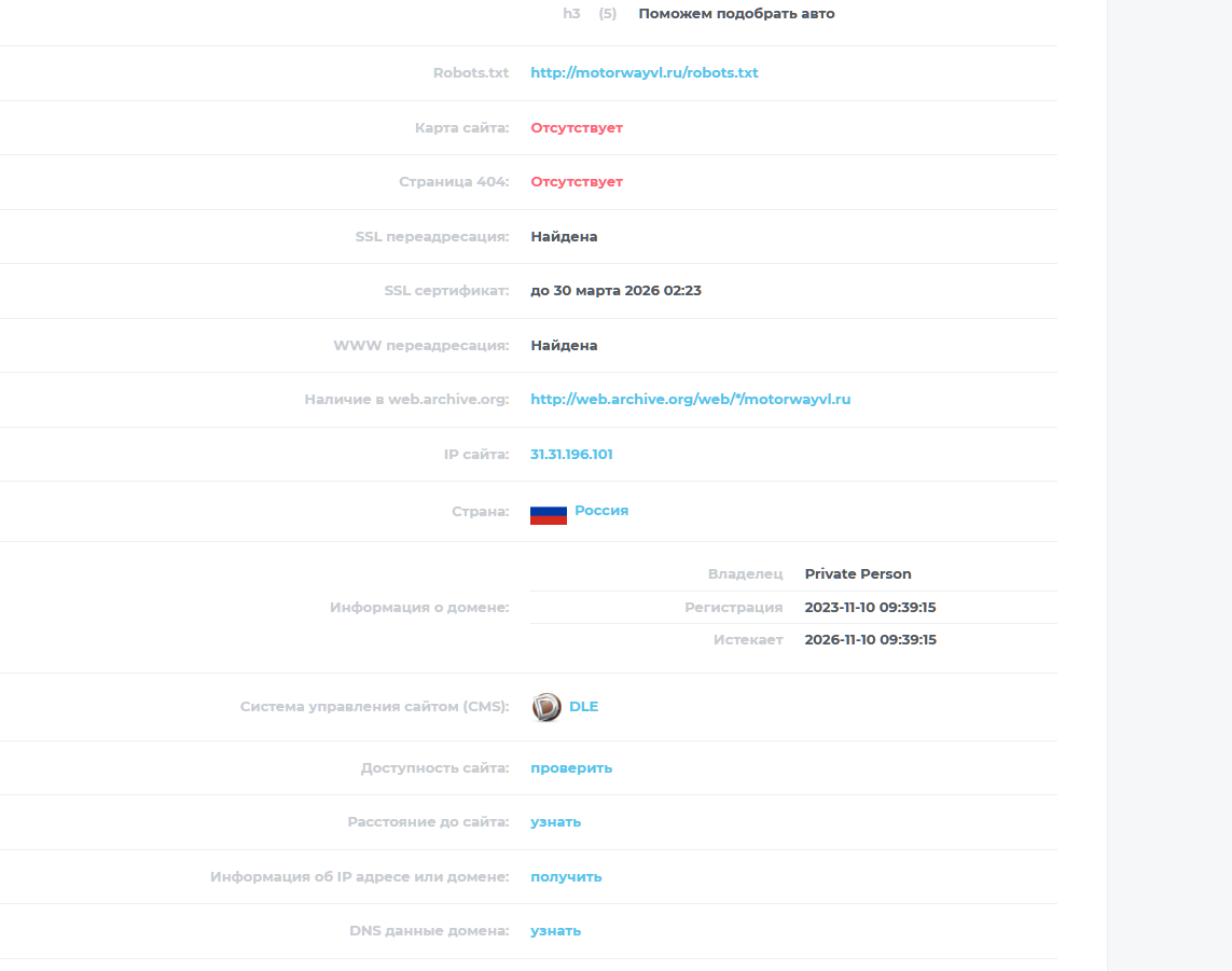Сайт фирмы motorwayvl зарегистрирован в 2023 году, имя регистратора скрыто. Никаких данных про фирму регистратора проекта не указано.