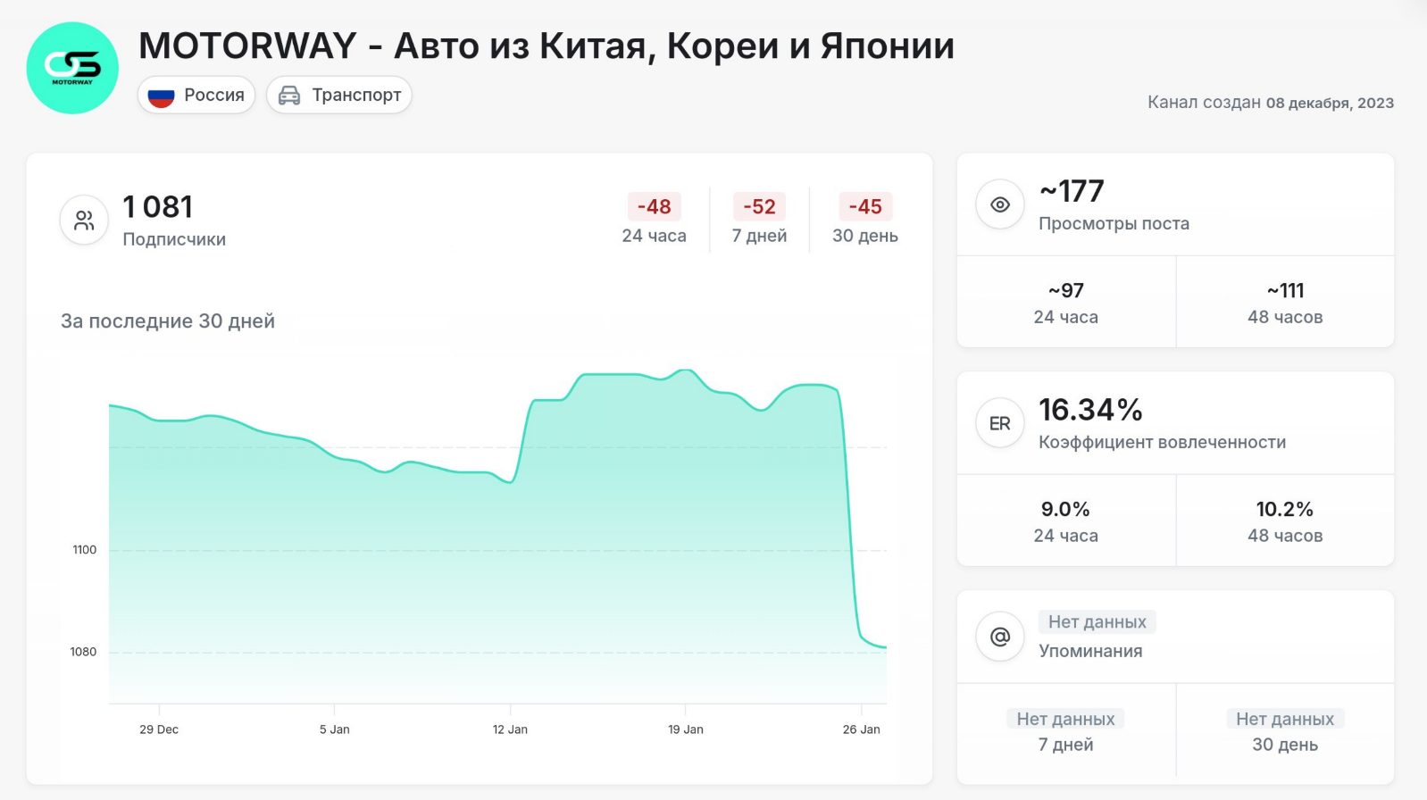 Читают посты в ТГ канале компании всего 16% аудитории, от проекта за неделю отписалось 52 человека. Явной накрутки трафика Motor Way Телеграмм канал не демонстрирует, но закрытые комменты вызывают сомнения в надежности этих дилеров.