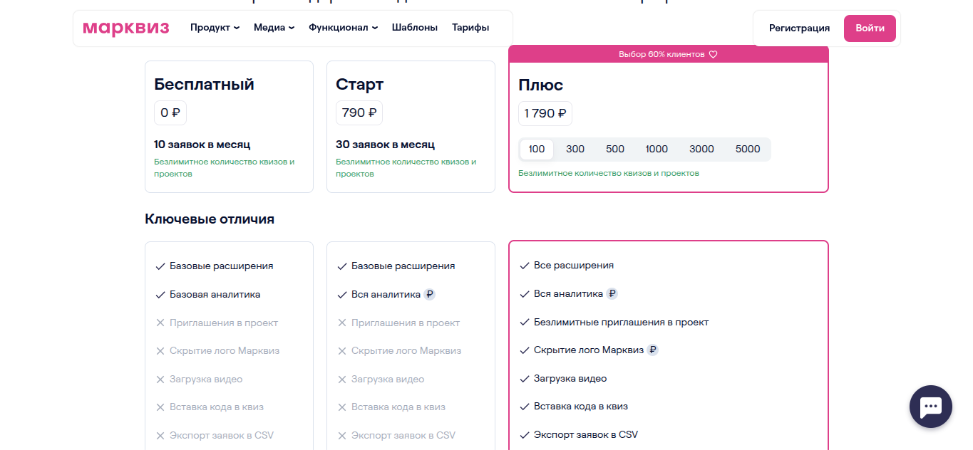 - «Плюс» Mrqzme. Цена от 1790 рублей за безграничное количество квизов и проектов. Включает в себя все расширения, аналитику, безлимитные приглашения в проекте, скрытие лого, загрузка видео, вставка кода в квиз, экспорт CSV, свой домен.