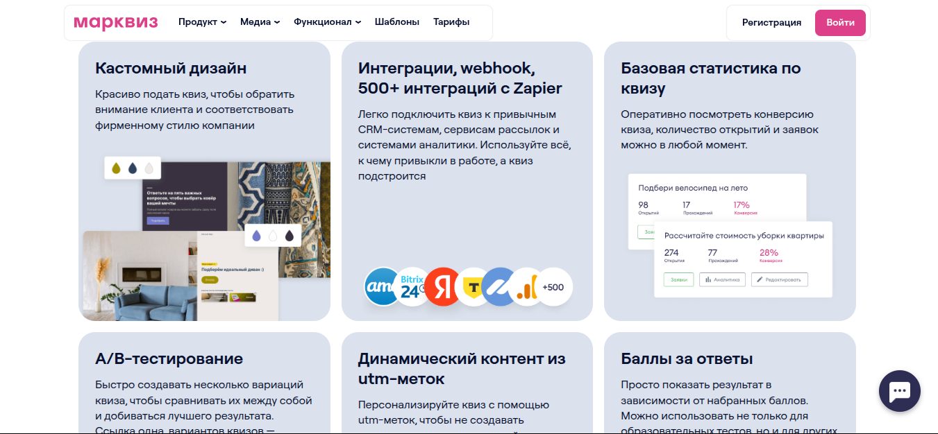 «Мркз ме» предлагает обширный функционал для создания опросников. Клиенты могут создавать онлайн-тексты прямо на сайте. Еще можно делать квиз-магазин, который после опроса предлагает соответствующий товар или переадресовывает на целевую страницу интернет-магазина. Более того, платформа предлагает кастомный дизайн для квиза, A/B тестирование, динамичные utm-метки, статистику и баллы за ответы.