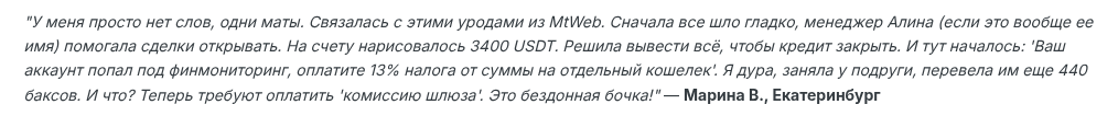 Трейдеры, установившие Mtweb, подключают счет — платят за него от 150 до 25 000 долларов. Далее они торгуют, видят прибыль, радуются, пытаются вывести средства. И здесь появится неприятности. Мол, якобы для вывода нужно оплатить дополнительную страховку/налог/залог или другую вымышленную услугу.