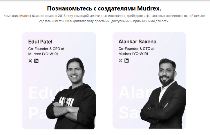 По официальным данным, компания основана в 2018, хотя сайт mudrex com появился немного раньше — 27 ноября 2017 года. Платформа ориентирована, в первую очередь, на индийских пользователей и предназначена для “простой, доступной, и прибыльной” торговли криптовалютой. Ее основателями выступили Аланкар Сахена и Эдул Пател.