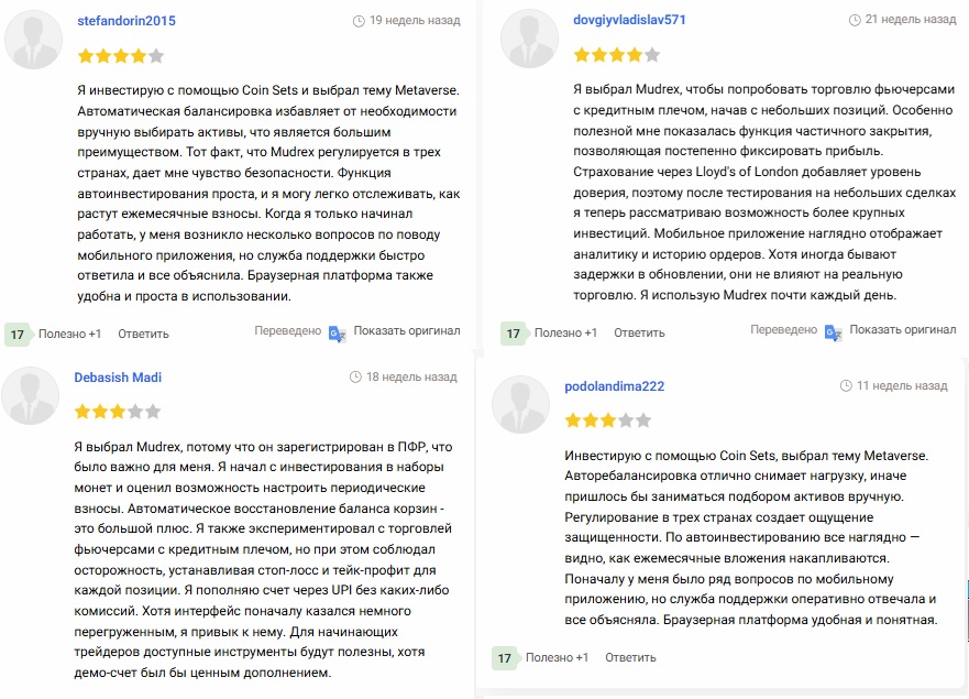 В сети есть большое количество отзывов о работе биржи Мудрекс. Они в основном положительные. Клиентам нравится, что торговый терминал простой и понятный для новичков, торговля автоматизирована, есть возможность использовать готовые наборы для своего инвестпортфеля. Негативные отклики — индивидуальные ситуации, на которые техподдержка быстро реагирует.