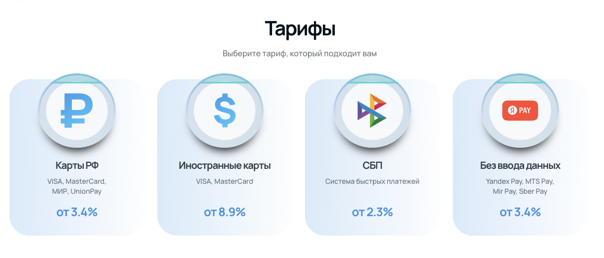За обработку платежей система взимает комиссию. Самая низкая предусмотрена для СБП — она составляет от 2,3% от суммы транзакции. Для российских карт и платежных решений — сбор от 3,4%, а для иностранных — от 8,9%.
