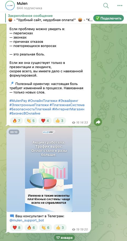 У компании есть официальный телеграмм-канал. Он называется Mulen, а размещается по адресу channel mulenpay. На него на 20 января 2026-го года подписаны 644 пользователя.