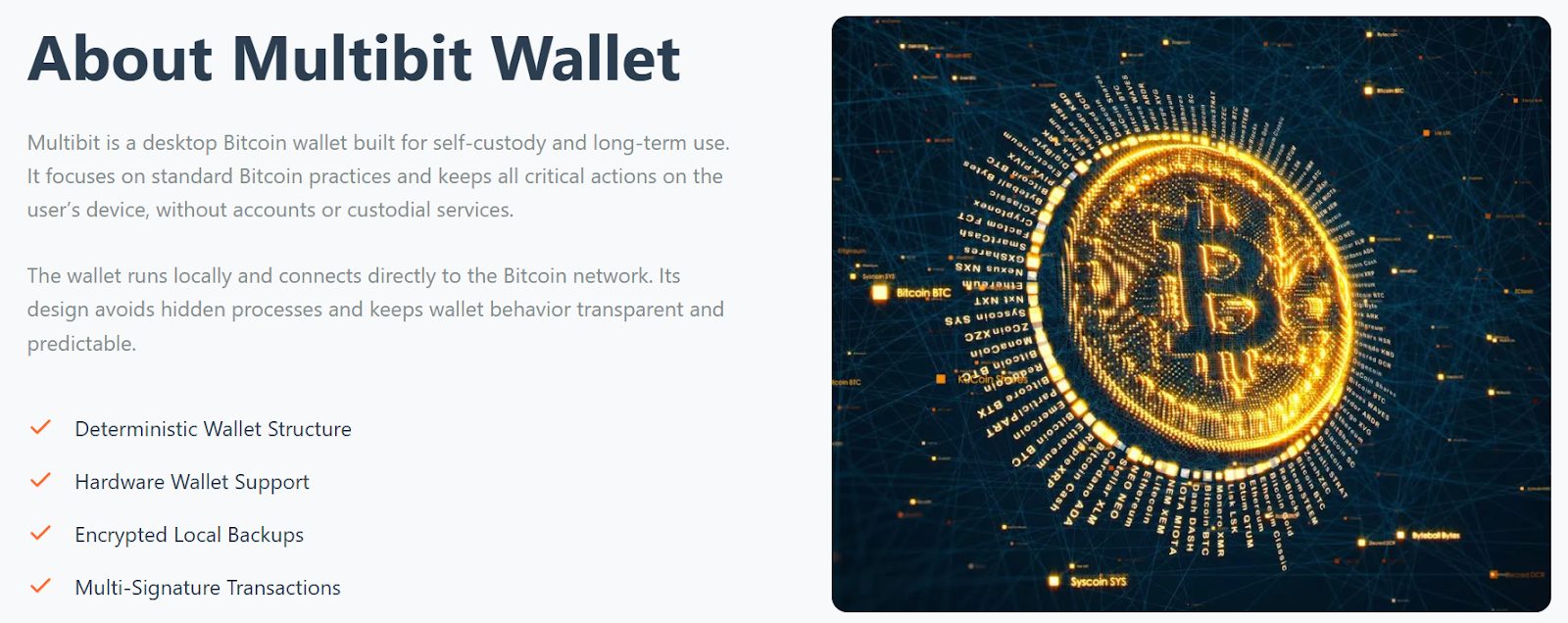 Кошелек «Мультибит» является настольным биткоин-кошельком, созданным для самостоятельного хранения и долгосрочного использования. Он направлен на стандартные операции с BTC. ПО хранит все важные операции на устройстве пользователя. Здесь нет необходимости использования учетных записей или кастодиальных сервисов. Кошелек работает локально и напрямую подключается к сети Bitcoin. Его конструкция исключает скрытые процессы и обеспечивает прозрачное и предсказуемое поведение кошелька. В качестве преимуществ отмечаются:
