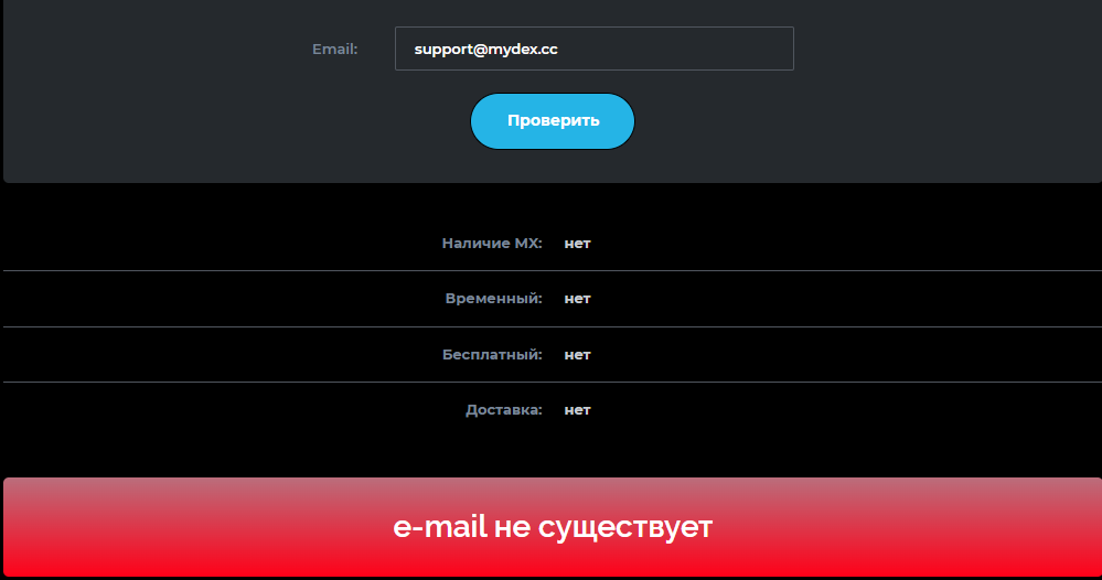 Основная же проблема заключается в том, что данный e-mail даже не является настоящим. Проверки показывают, что все электронные почты с сайта фейковые.